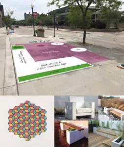 The final art installation is called the Living Room Project. This project will be located at the intersection of the N. 8th Street and Wisconsin Avenue. The project is being completed in partnership with Active8 (formerly SOUP) and will consist of a painted “living room carpet” by a local artist on the concrete and living room style furniture either constructed from wood and/or concrete by Quasius Construction. The project will encourage the positive exchange of conversation on the street similar to the situation that a living room accomplishes.