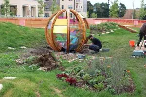 Over the past few weeks, the area at City Green that is fenced off has been prepared for a new art installation named P.E.A.R.L., which stands for Prism, Emitting, Abstracted, Radiant, Light installation. Created by artist and architect Michael Moore and his architecture firm, tres birds workshop, P.E.A.R.L. will be a seen as a communal space where art, music, and literature merge. This art piece was inspired by the Sheboygan community’s experiences with wild animals as well as the connection between the John Michael Kohler Arts Center, the Mead Public Library, and the future Art Preserve. Community conversations and workshops led tres birds to create a focal point in the form of a glass sphere that emits and reflects light, and is lit from within at night. The entire sculpture is nestled between three moraines, or hills, that can be walked on and interacted with. The work was inspired by the Sheboygan community’s experiences with wild animals as well as the spatial connection between the John Michael Kohler Arts Center, Mead Public Library and the future Art Preserve.