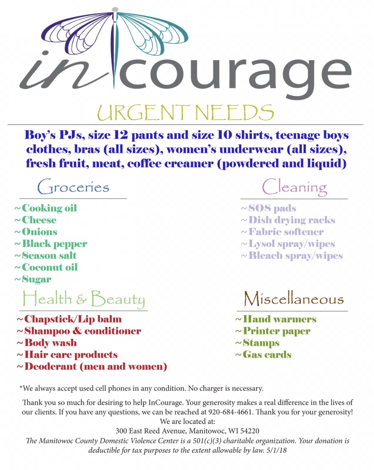 For the past few weeks, we here at Seehafer Broadcasting have had a donation box in our lobby, with collected items going to InCourage in Manitowoc. The final tally shows that the People of Manitowoc have donated around 250 items, filling the box to the brim! Thank you to everyone that donated, and also job well done to our own Ruby Gutierrez for all the work she put into the project. Even though our holiday drive is complete, InCourage is still in need of many items. To See how you can still donate, go to incouragewi.org/donation. Below is a list of items, that InCourage is still in need of.