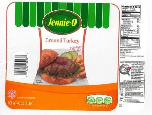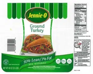 - 3-lb. packages of “Jennie-O GROUND TURKEY 93% LEAN | 7% FAT” with “Use or freeze by” dates of 11/12/18 and 11/13/18 on the side of the trays.