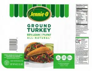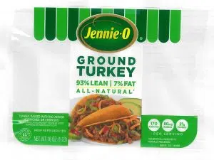 - 1-lb. packages of “Jennie-O GROUND TURKEY 93% LEAN | 7% FAT” with “Use or freeze by” dates of 11/12/18 on the side of the trays.
