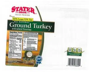 - 3-lb. packages of “STATER BROS. 85% LEAN | 15% FAT ALL NATURAL Ground Turkey” with a “Use or freeze by” date of 11/12/18 on the side of the trays.