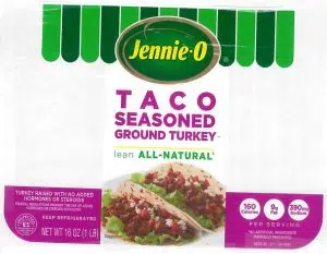 - 1-lb. packages of “Jennie-O TACO SEASONED GROUND TURKEY” with “Use or freeze by” dates of 11/12/18 on the side of the trays.