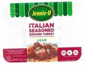 - 1-lb. packages of “Jennie-O ITALIAN SEASONED GROUND TURKEY” with “Use or freeze by” dates of 11/12/18 on the side of the trays.