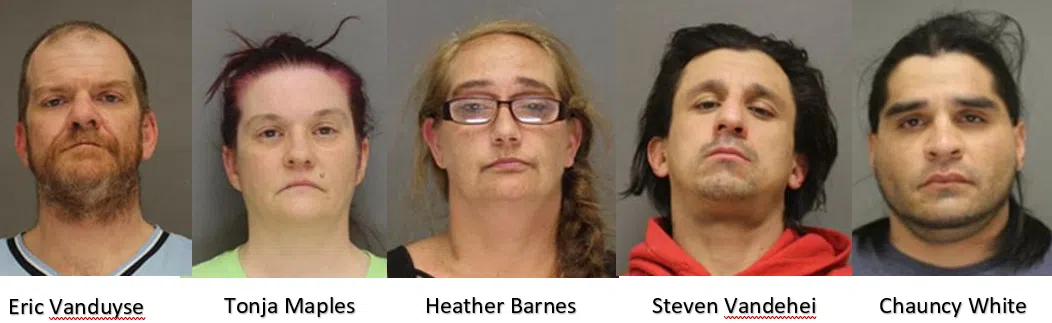 The suspects, 42-year-old Eric P. Vanduyse, 45-year-old Heather A. Barnes, 48-year-old Tonja J. Maples, and 39-year-old Steven R. Vendehei, would reportedly burglarize storage units, buildings, and construction sites and then trade the stolen property to 36-year-old Chauncy F. White for marijuana and methamphetamine.