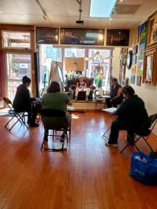 Artists work on their “Spittin’ Image” portraits of model, Lee Nudelmann. Photo provided.