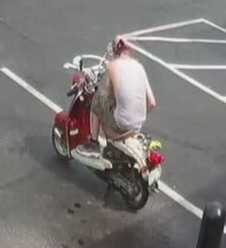 The suspect, who was wearing a camo hat, grey tank top, camo shorts, and black and grey shoes, was driving a red and white moped and fled the scene north on Johnston Drive.