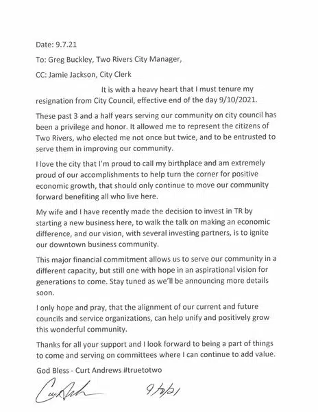 Two Rivers City Council President Curt Andrews has announced that effective this Friday (September 10th), he will no longer be a part of the Council.