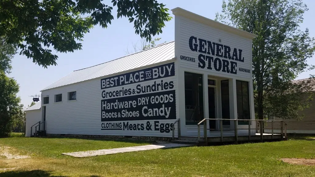 Our Manitowoc County Historical Society recently added a hand-painted advertising mural to 1870s General Store at Pinecrest Village, announcing it as the “Best Place to Buy – Groceries & Sundries; Hardware, Dry Goods, Boots & Shoes, Candy, Clothing, Meats & Eggs.”