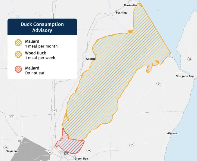 Hunters are asked not to eat any mallards harvested on Lower Green Bay from Longtail Point across to Point au Sable and south to the mouth of the Fox River.