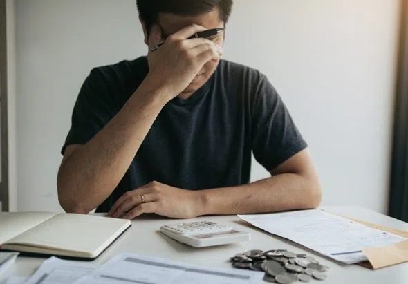 Asian men are stressed about financial problems, with invoices and calculators placed on the table while having stress on problems with home expenses.