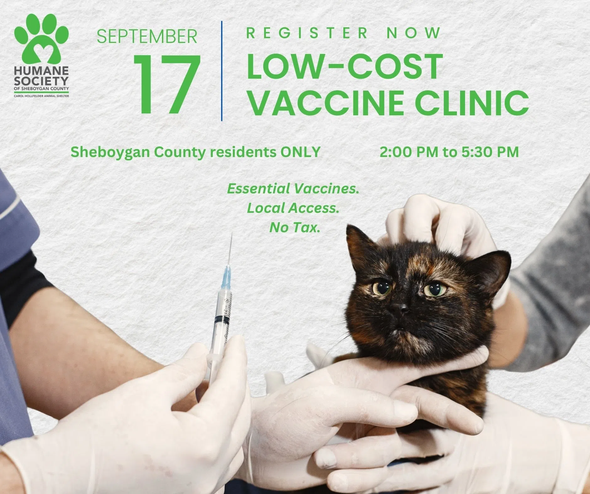 Pet owners in the Sheboygan area will be able to save some money on animal vaccines next week. The Humane Society of Sheboygan County will be hosting a low-cost vaccine clinic on Tuesday (September 17...