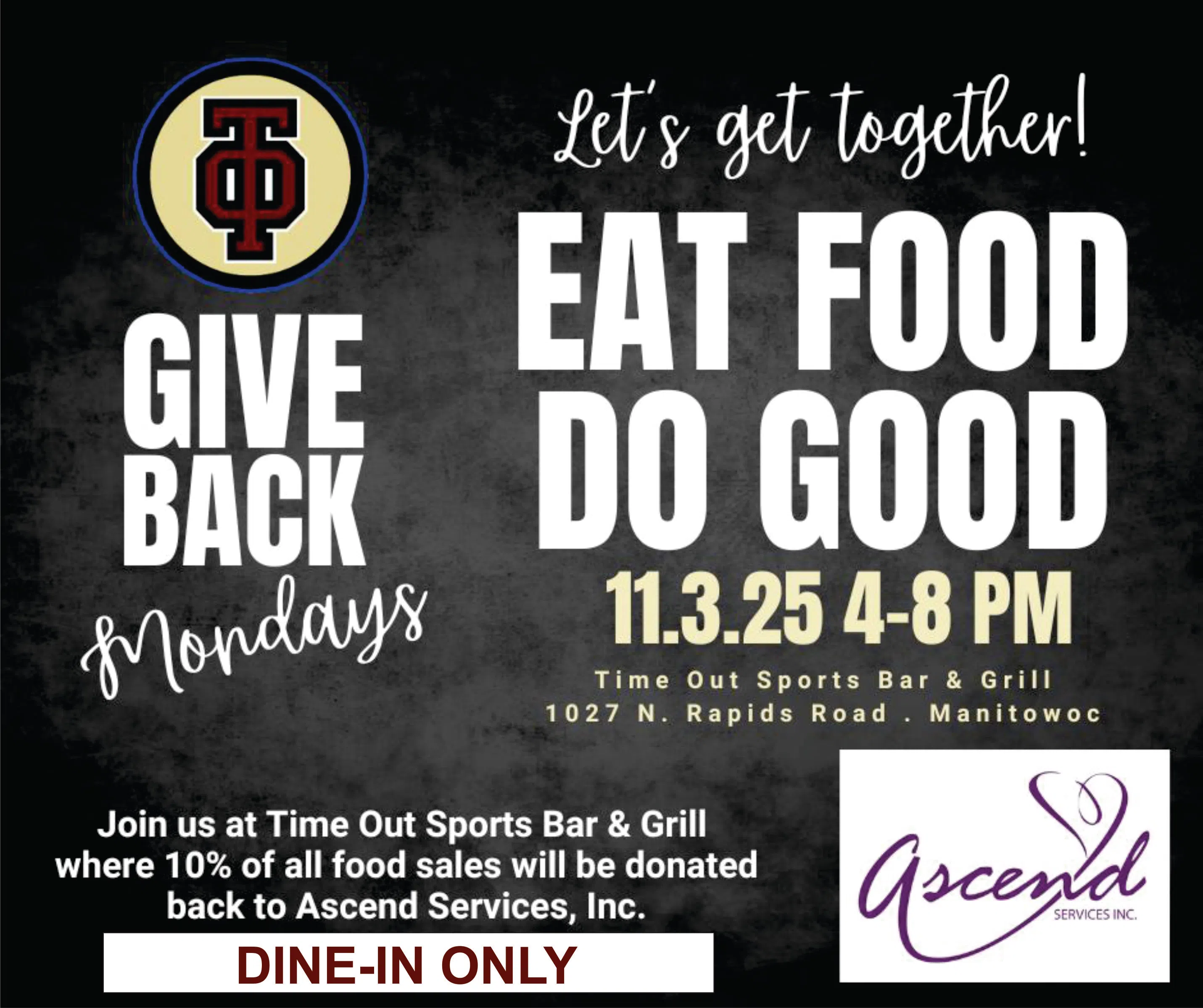 Ascend Services Inc. is teaming up with a popular local sports bar for a fundraising event. On Monday, November 3rd, Ascend team members will be at Time Out Sports Bar and Grill from 4:00 to 8:00 p.m....